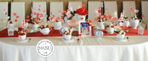Tableau de mariage: tavola apparecchiata a tema sullo stile di quella del cappellaio matto: teiere, tazze, zuccheriere, fiori e tanta fantasia.