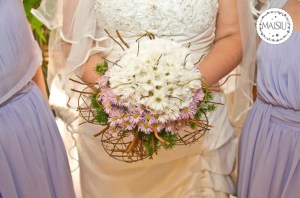 Matrimonio a tema : lilla e bianco. Dettaglio sposa, bouquet e damigelle.